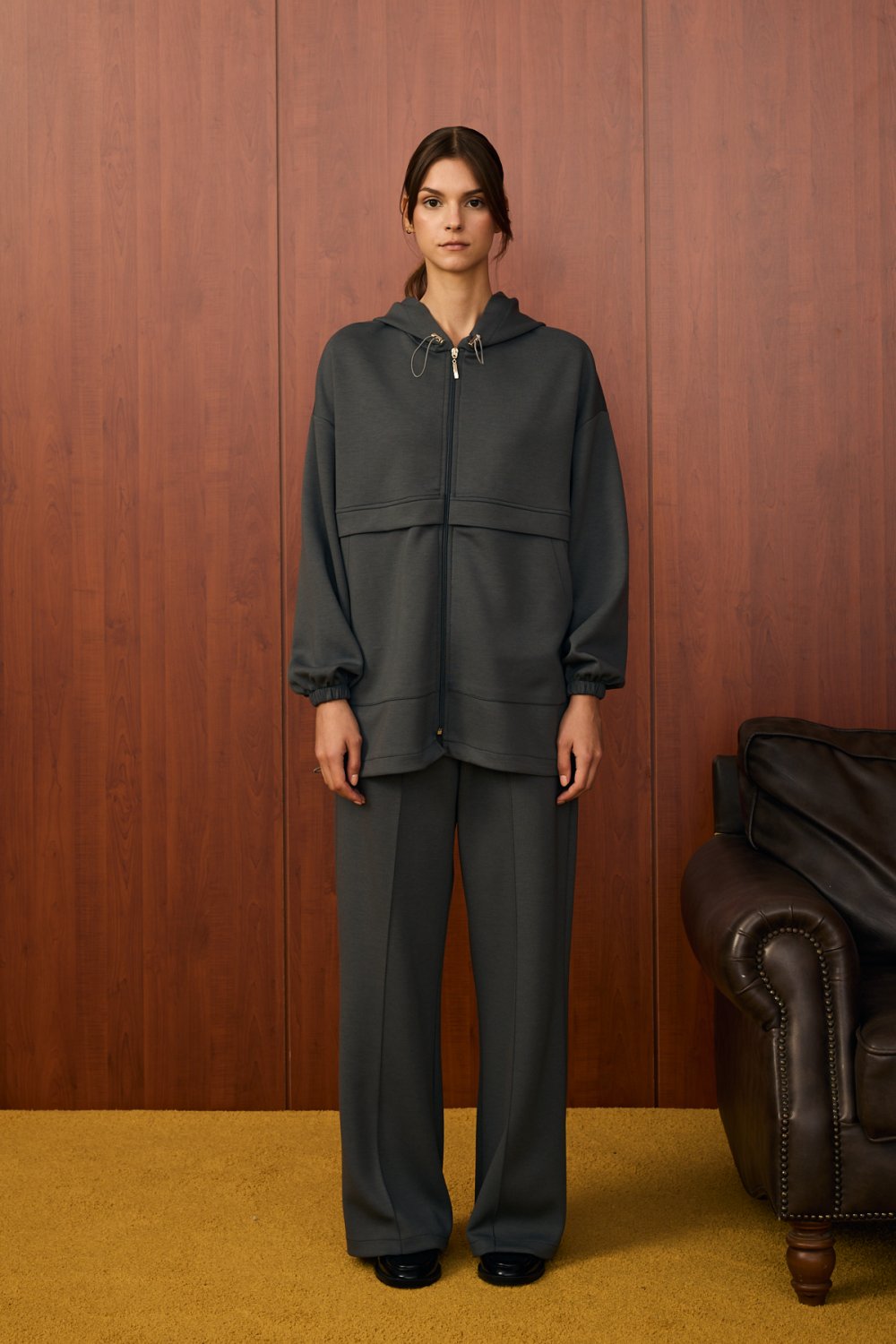 Detaylar: Fermuar ve geniş cep detaylı üst, bol paça pantolon