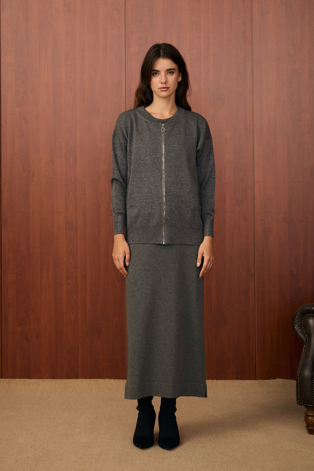 Simli yapısıyla zarafeti ön plana çıkaran bu takım, sade şıklık arayanlar için ideal bir seçenektir. Hafif parlak dokusu ve düz kesimiyle gündüzden geceye kullanım kolaylığı sunar. Ceket kısmında yer alan metalik fermuar detayları, modern bir dokunuş kazandırır.