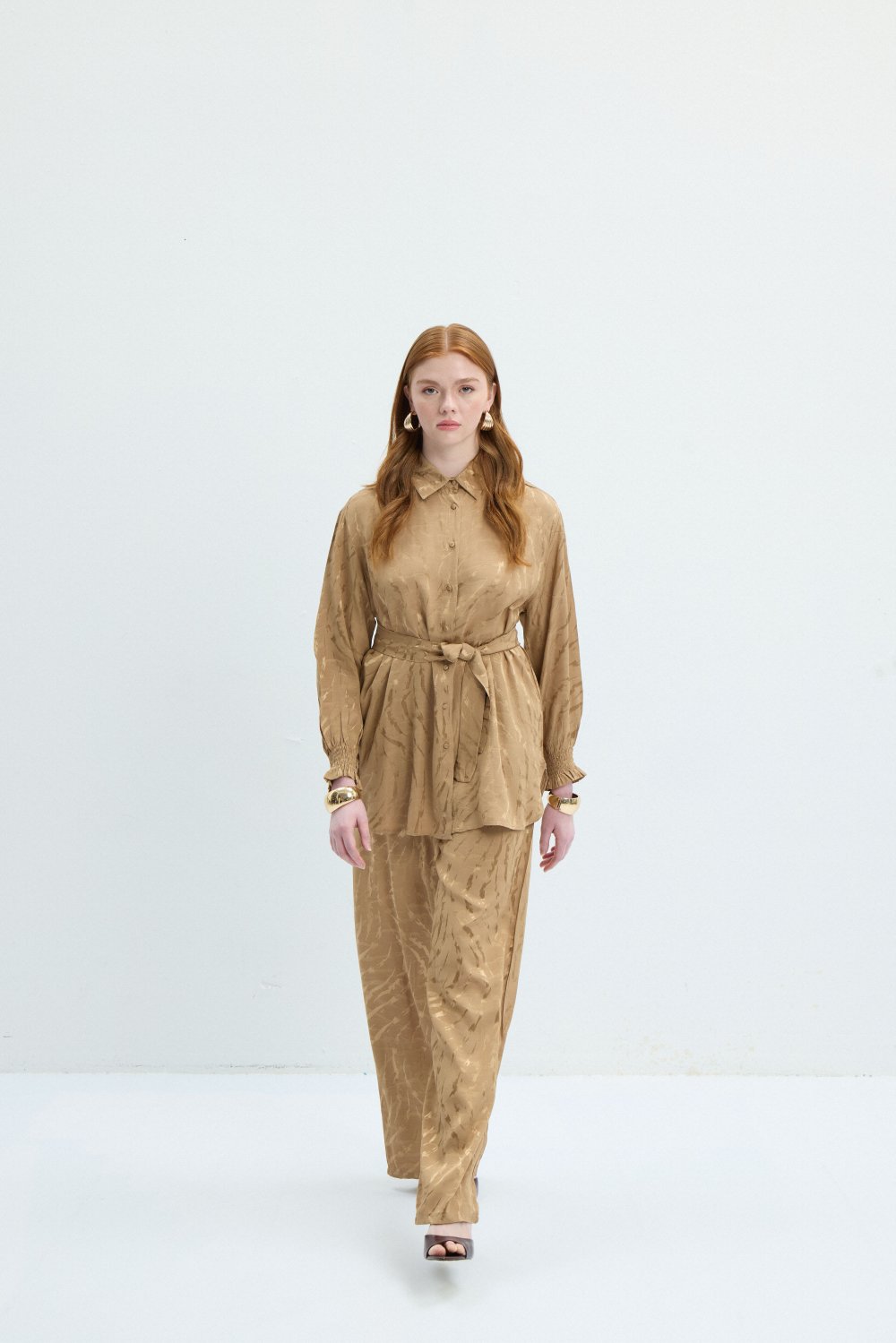 Saten krep kumaşıyla modern ve şık bir tasarım sunan bu takım, yumuşak dokusu ve dökümlü yapısıyla konfor ve estetiği bir araya getiriyor. Üst kısmı zarif bir şekilde vücudu saran kuşak detayıyla tamamlanırken, gizli düğme tasarımı şıklığınıza sofistike bir dokunuş katıyor. Geniş paçalı alt tasarımıyla hem klasik hem de modern bir duruş sergileyen bu set, özel günlerden günlük şıklığa kadar her ortamda rahatlıkla kullanılabilir.