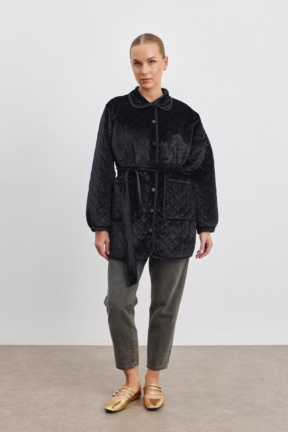 Zarif ve rahat bu kadife kuşaklı ceket, soğuk havalarda stilinizi tamamlayacak mükemmel bir parça. Yumuşak kadife kumaşı, dikişli detayları ve bele oturan kuşağıyla dikkat çeker. Ceketin boyu 77 cm olup, geniş kesimi sayesinde rahatlık sunar. Hem şık hem de pratik olan bu ceket, günlük kullanıma uygun ve stil sahibi bir görünüm yaratır. Beden seçenekleri 1/2 aralığında sunulmuştur.