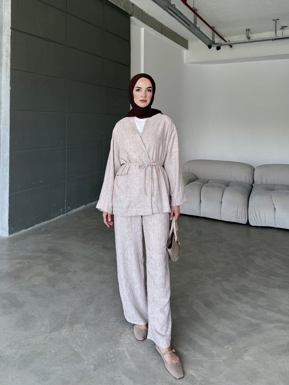 Doğal ve nefes alabilen keten kumaşı ile rahatlığın ön planda olduğu bu takım, hem günlük kullanıma hem de özel kombinlere uygun şık bir seçenektir. Kruvaze yaka üst tasarımı modern bir duruş katarken, bağlama detayıyla vücuda uyum sağlar. Bol kesimli pantolonu sayesinde konforlu bir kullanım sunar.