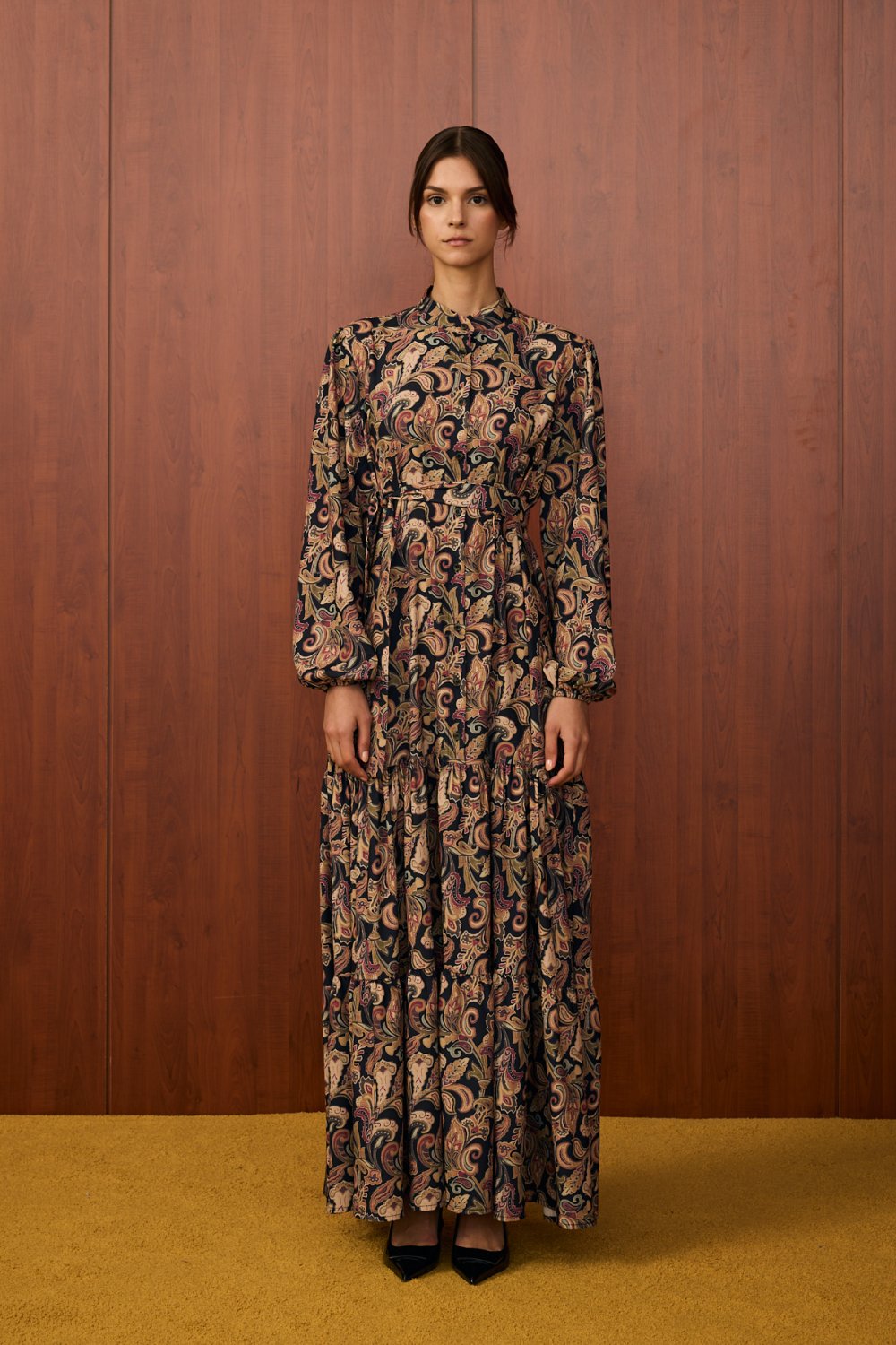 Detaylar: Gömlek yaka, düğmeli ön kısım, belden kemerli tasarım ve katmanlı etek